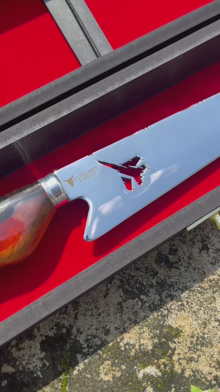 A Faca Aviador foi projetada para aqueles que sempre querem mais – mais estilo, mais precisão e mais exclusividade. Uma peça perfeita para quem leva a paixão pela aviação para todos os aspectos da vida, inclusive para o churrasco e a cozinha.