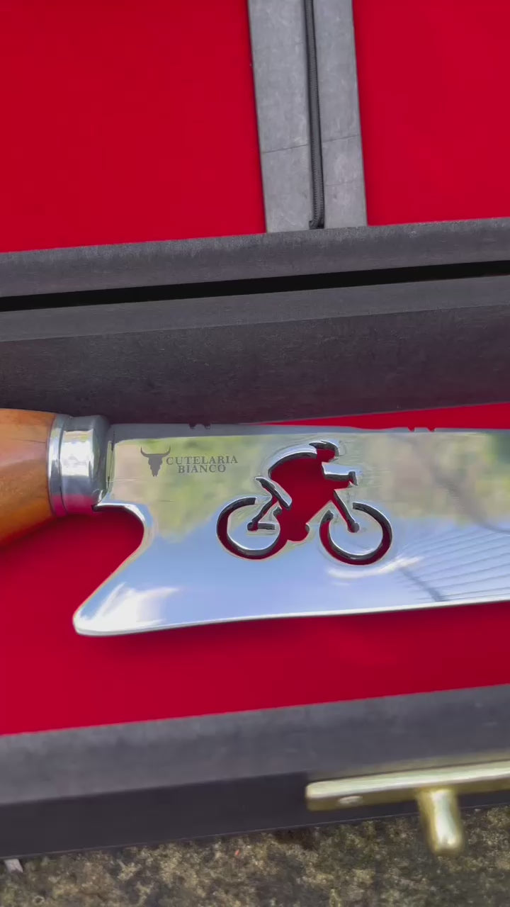 Forjada com precisão artesanal, essa faca leva consigo a liberdade das bicicletas, literalmente. Sua lâmina robusta, decorada com um vazado em forma de bike, não é apenas um detalhe, mas uma declaração. Já o cabo em cristal líquido abriga um pingente de bicicleta, um toque de sofisticação pensado para aqueles que vivem intensamente cada aventura.