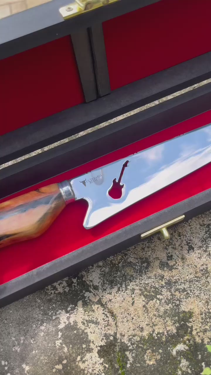 A lâmina de precisão vem com um vazado em forma de guitarra, simbolizando a força do rock e a perfeição de cada corte. Se você é um verdadeiro fã de música, sabe que essa faca carrega a rebeldia e o poder do palco em cada detalhe.